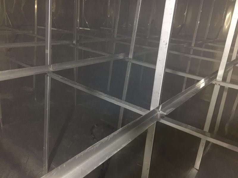 主拉主要作用是防止水箱變形,厚度一般采用靠近底板的側(cè)板厚度為基準(zhǔn),規(guī)格為4cm*4cm。其焊接間距一般為1000mm一條,大型水箱特別是高度超過(guò)3米以上的。其間距應(yīng)該為500mm一條,連接處必須進(jìn)行滿(mǎn)焊處理。