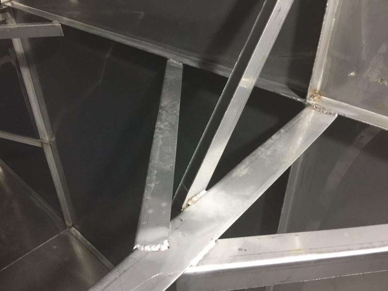 斜拉主要的作用在于分擔(dān)主拉筋的拉力,進(jìn)一步對(duì)水箱板進(jìn)行穩(wěn)固,切成500mm的長(zhǎng)度,連接在水箱與主拉之間。形成龍爪式,常規(guī)尺寸為4cm*1cm厚度一般以靠近頂部的側(cè)板厚度為基準(zhǔn),連接處必須進(jìn)行滿(mǎn)焊處理。
